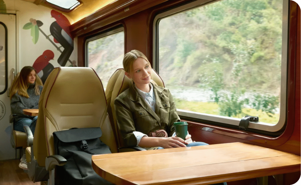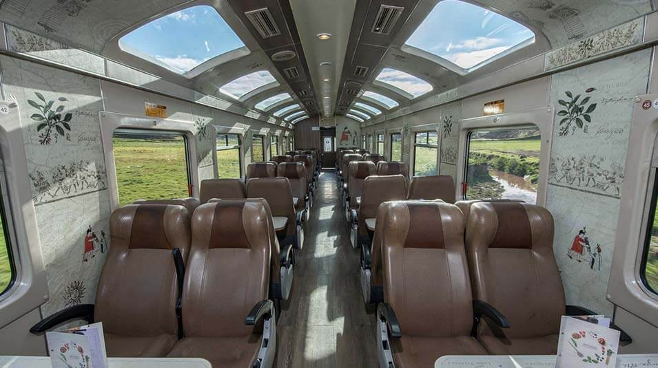 Es el tren más económico de PeruRail. Ofrece un ambiente funcional, con asientos cómodos, música andina y amplias ventanas laterales. Es ideal para quienes quieren llegar de forma rápida y sin lujos, pero disfrutando del paisaje del Valle Sagrado.